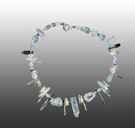 Aquamarine, Cornflake pearls, Lapis lazuli, Sterling silver, Swarovski crystals.